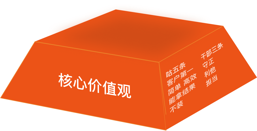 价值观咕五条:客户第一、简单、高效、能拿结果、不装干部三条:守正、利他、担当